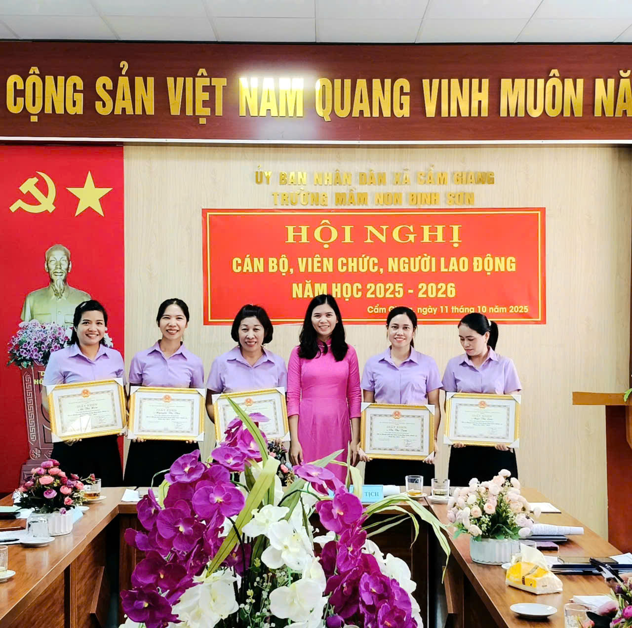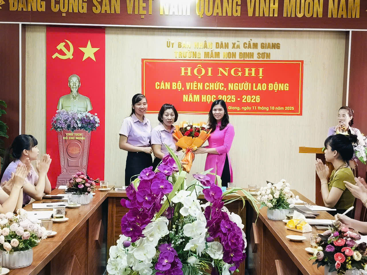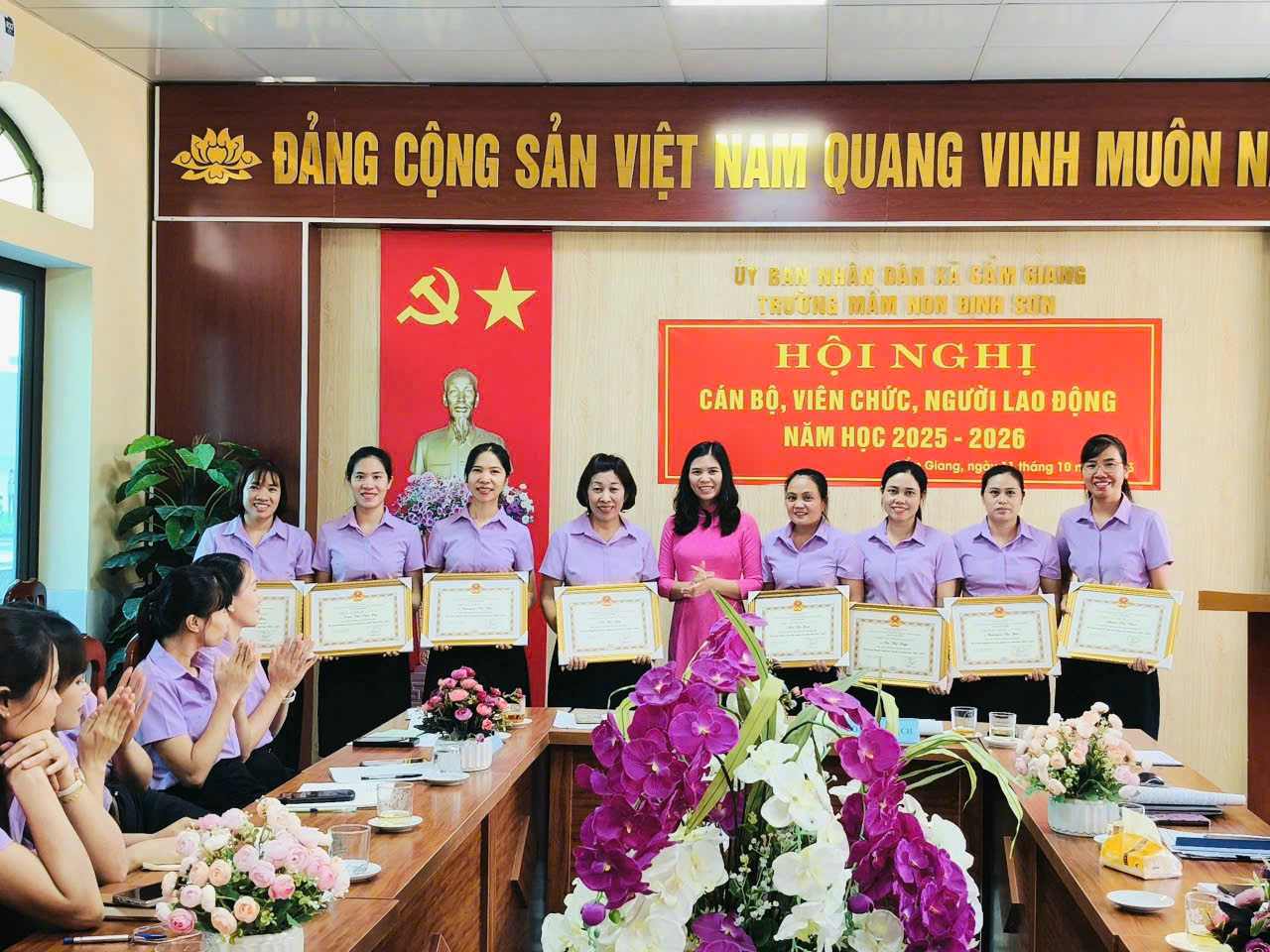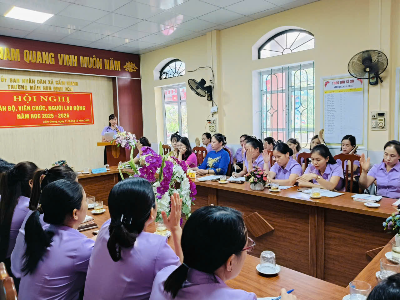 Thực hiện Hướng dẫn số 7074/HD-SGDĐT ngày 25/9/2025 của Sở Giáo dục và Đào tạo thành phố Hải Phòng và Công văn số 588/UBND-VHXH ngày 29/9/2025 của UBND xã Cẩm Giang về việc tổ chức Hội nghị cán bộ, viên chức, người lao động năm học 2025 – 2026; sáng ngày 11/10/2025, Trường Mầm non Định Sơn long trọng tổ chức Hội nghị cán bộ, viên chức, người lao động năm học 2025 – 2026.