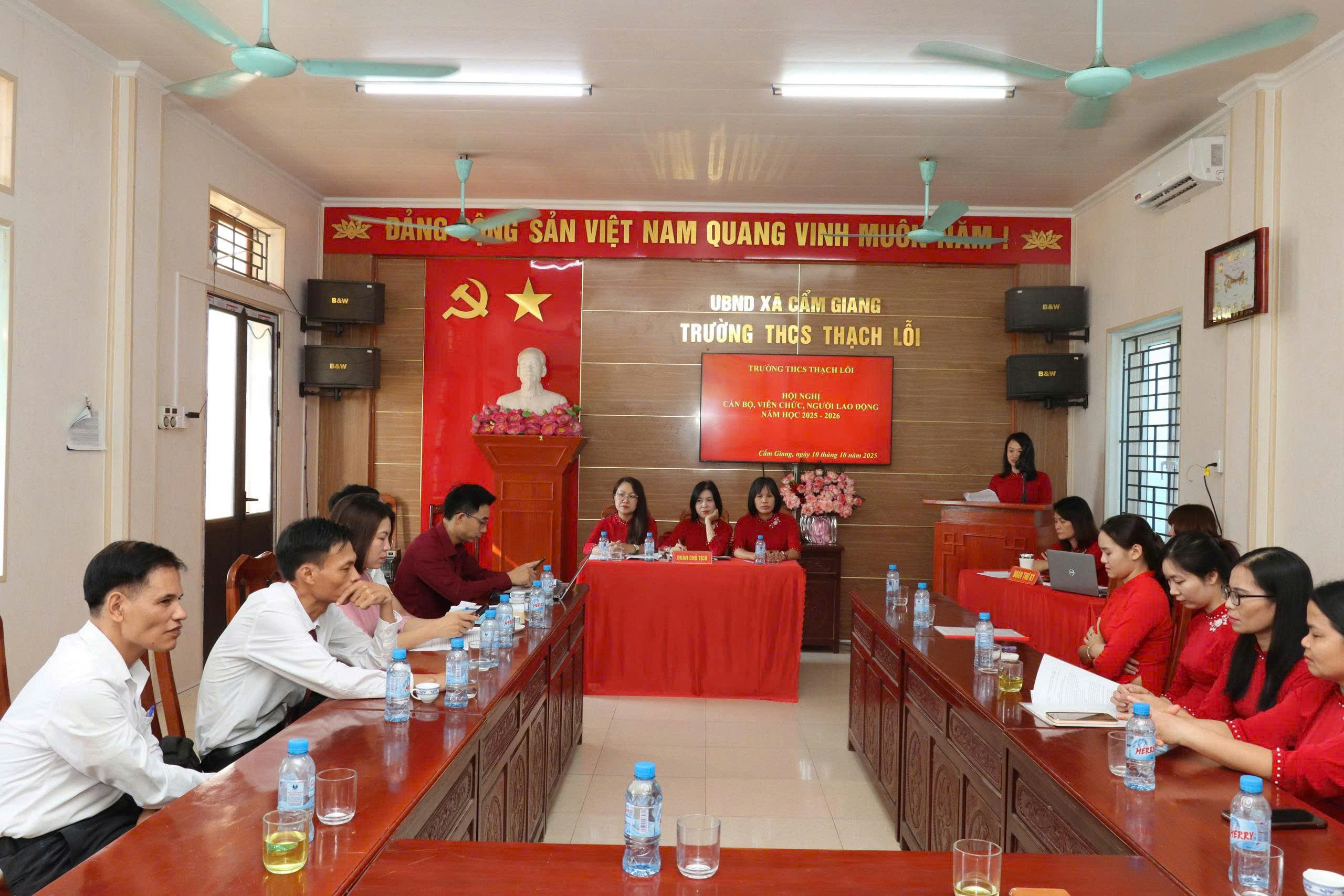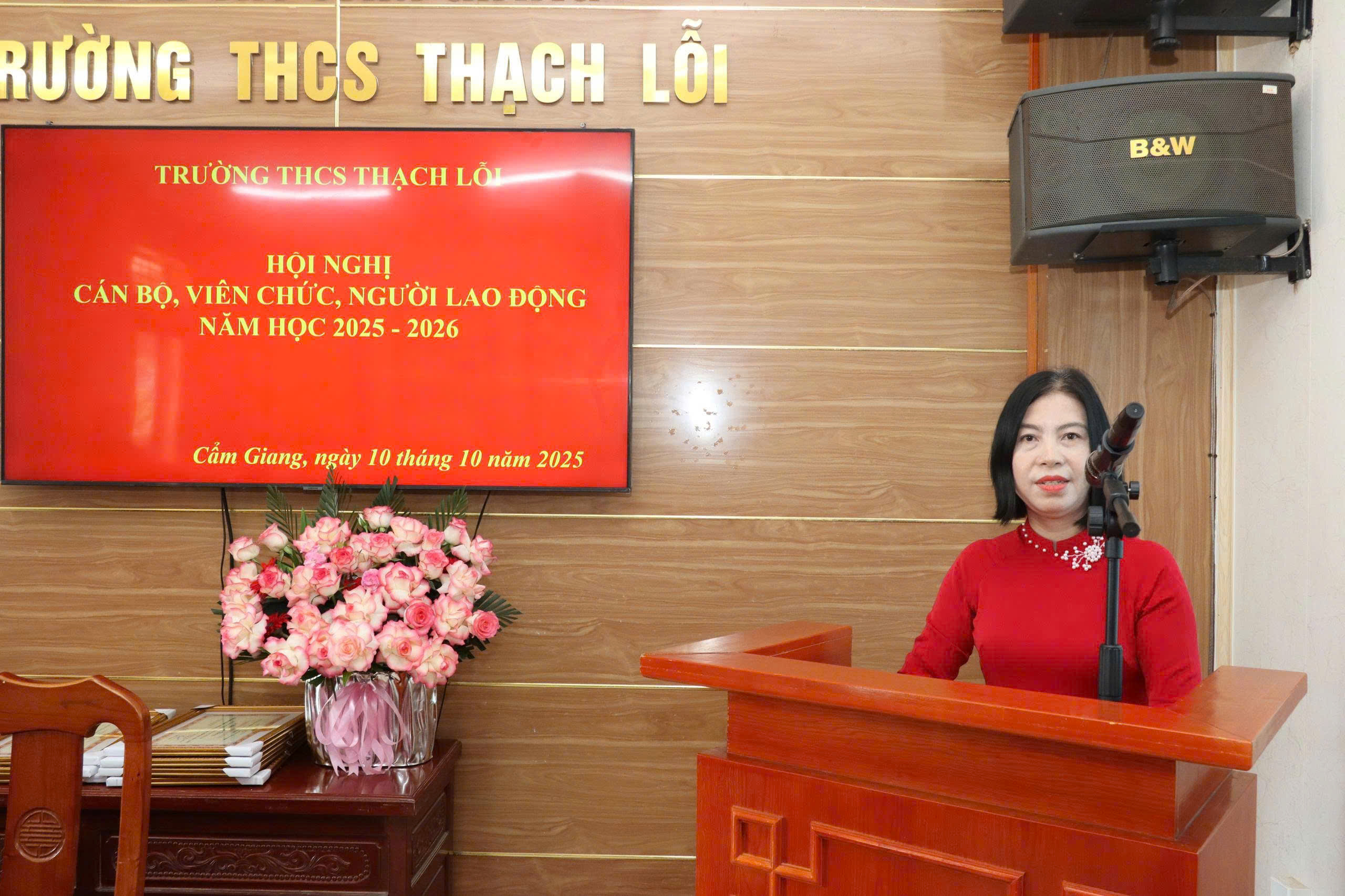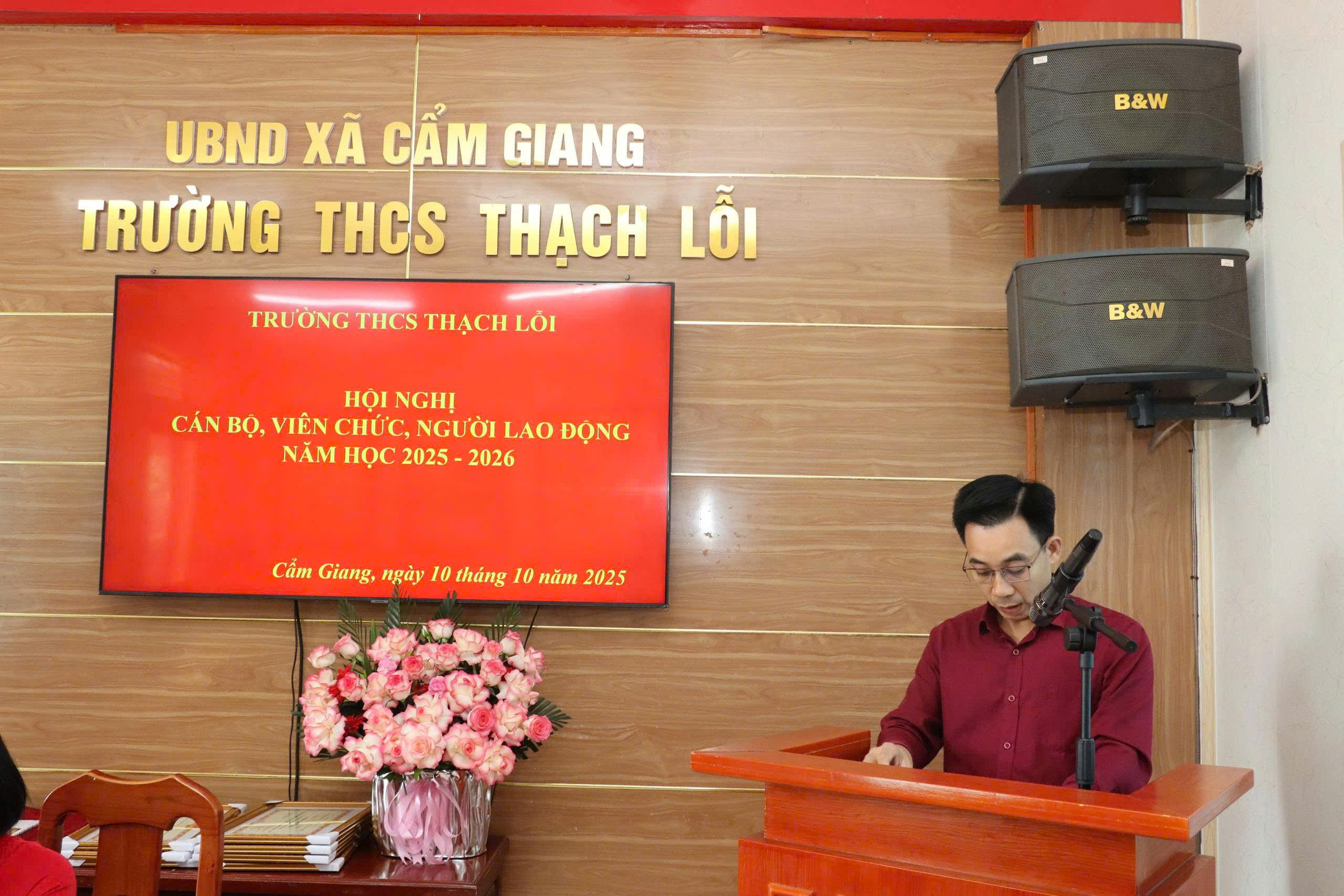 Phát biểu tại hội nghị, đồng chí Hoàng Văn Luân – Chánh Văn phòng Đảng ủy xã Cẩm Giang ghi nhận và biểu dương những nỗ lực, cố gắng của tập thể cán bộ, giáo viên và học sinh Trường THCS Thạch Lỗi trong năm học vừa qua. Đồng chí đề nghị mỗi cán bộ, giáo viên cần tiếp tục tự học, tự bồi dưỡng nâng cao trình độ chuyên môn, nghiệp vụ; phát huy tinh thần trách nhiệm, kỷ cương, nề nếp trong giảng dạy và học tập; tích cực đổi mới phương pháp dạy học, ứng dụng công nghệ thông tin, tăng cường giáo dục đạo đức, kỹ năng sống, giáo dục môi trường và giáo dục địa phương cho học sinh. Đồng chí bày tỏ tin tưởng tập thể sư phạm Trường THCS Thạch Lỗi sẽ tiếp tục đoàn kết, nỗ lực vượt qua khó khăn, hoàn thành thắng lợi các nhiệm vụ năm học 2025 – 2026.