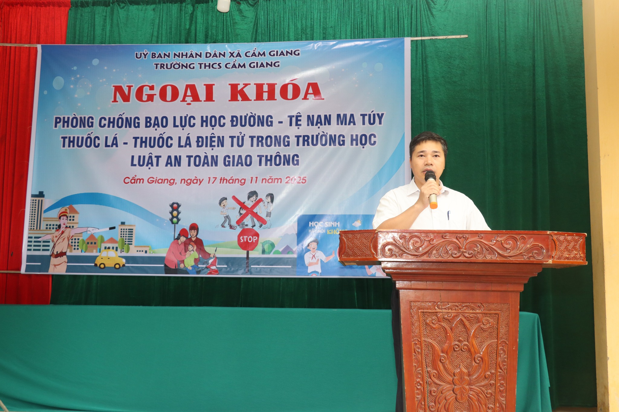Sáng ngày 17/11/2025. Trường THCS Cẩm Giang phối kết hợp cùng Công An xã tổ chức sinh hoạt ngoại khóa phòng chống bạo lực học đường, tệ nạn ma túy và thuốc lá điện tử và luật giao thông đường bộ Dự buổi sinh hoạt có đồng chí Bùi Quang Việt - Phó trưởng Công an xã cùng các đồng chí trong đội cảnh sát giao thông trật tự và phòng chống tệ nạn xã hội của công an xã. Về phía nhà trường có đồng chí Lê Đình Mai - Bí thư chi bộ, hiệu trưởng nhà trường cùng toàn thể cán bộ, giáo viên, nhân viên và học sinh thuộc các khối lớp của nhà trường.